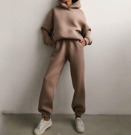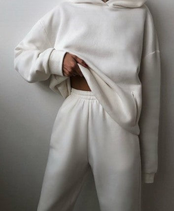 Deze set bestaat uit een comfortabele hoodie en bijpassende sweatpants, die een complete outfit bieden voor ultieme warmte en comfort. De hoodie heeft een zachte en pluche stof die uitzonderlijke warmte en isolatie biedt. De relaxte pasvorm en verstelbare capuchon met trekkoord zorgen voor een comfortabele en aanpasbare pasvorm. De kangoeroezak voegt een functionele en trendy touch toe, perfect om je handen warm te houden of kleine benodigdheden in op te bergen.
